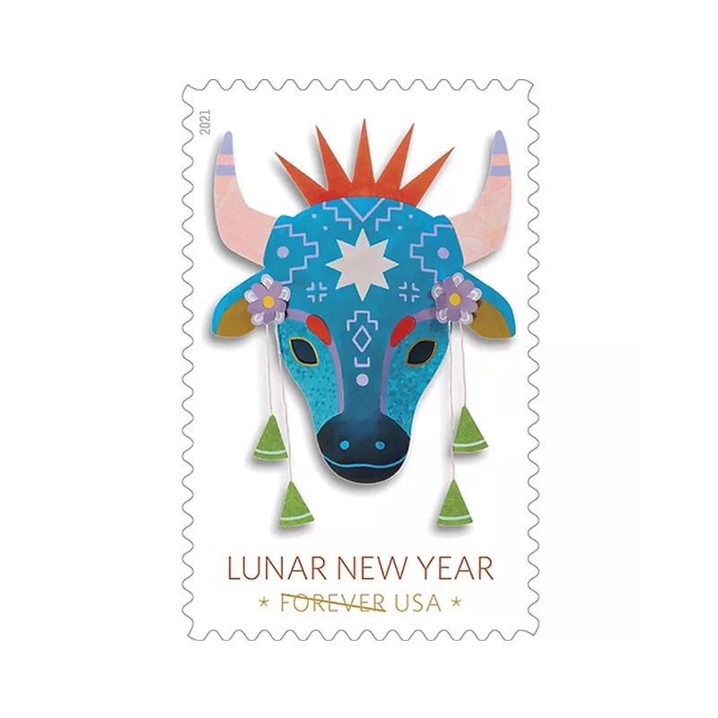 The mask design on the stamp incorporates symbolic elements. Some of these patterns are made in the style of Asian textiles. Purple flowers represent the arrival of spring. In Chinese culture, the Lunar New Year also marks the arrival of spring. The star in the center of the bull's head represents the celestial phenomena of the Chinese zodiac.