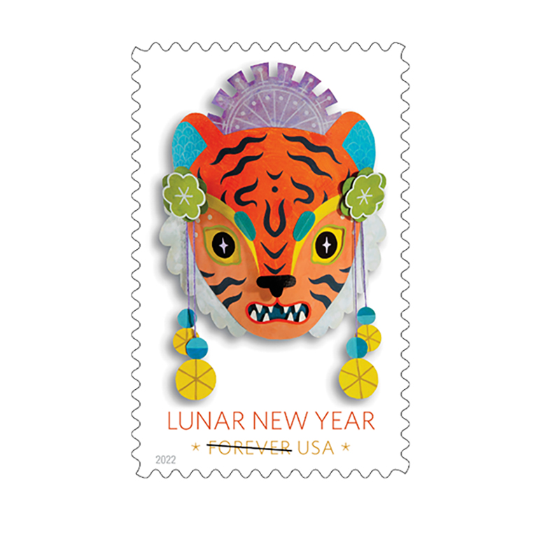 Utilizing orange as the predominant color—characteristic of the markings of Bengal tigers and said to be one of the lucky colors for individuals born during the Year of the Tiger—the tiger mask in the stamp design incorporates elements with symbolic meaning. Several of the patterns and details were created with the style of Asian textiles in mind as well as green flowers that represent the arrival of spring, which Lunar New Year also signals in Chinese culture. The motif atop the tiger’s head—printed with purple foil—references the celestial themes of the Chinese zodiac. On the stamp pane, simplified illustrations of the 12 zodiac animals are printed with gold foil.